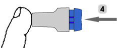 3. Massez doucement le bout du doigt puis nettoyez-le avec une lingette alcoolisée. Patientez jusqu'à ce que le doigt soit sec. 4. Placer la lancette contre le bout du doigt et appuyer sur le bouton poussoir coloré.  5. Pressez jusqu'à ce qu'une goutte de sang sorte du bout du doigt. Ouvrez le tube en plastique et enlevez précautionneusement le capillaire en verre. Tenez le capillaire horizontalement dans la goutte de sang jusqu’à ce qu’il soit complètement rempli. 6. Placez le capillaire rempli dans le tube contenant le tampon et fermez le tube avec le capuchon. Agitez le tube plusieurs fois jusqu'à ce que le sang du capillaire soit mélangé complètement avec le tampon.